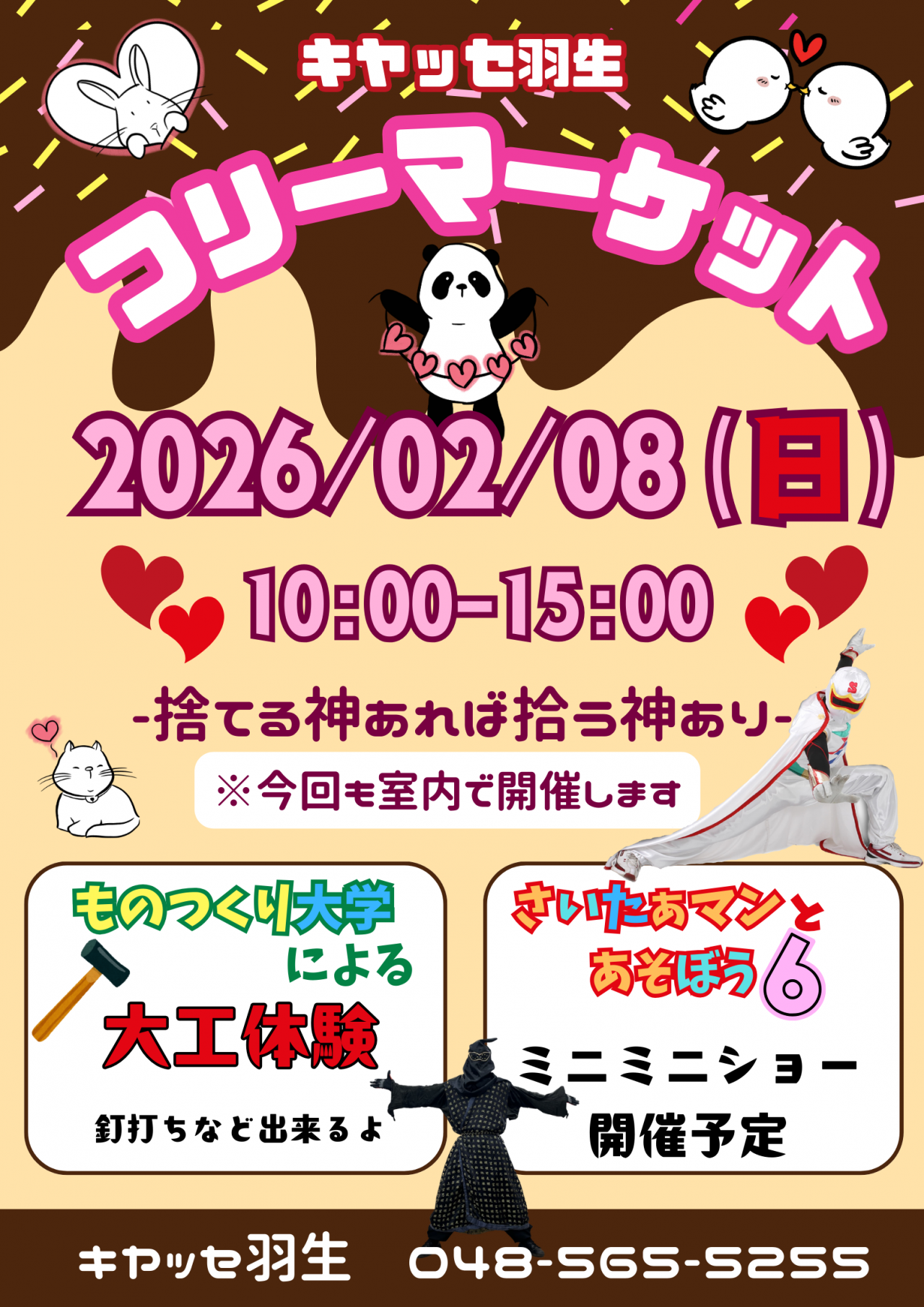 ◆内容:毎月第2週の日曜日にキヤッセ羽生にて開催しています「フリーマーケット&さいたぁマンヒーローショー」を2月も開催します!!今回は特別企画として、ものづくり大学さんに「大工体験」を開催していただきます!参加費無料で大工用具の体験ができます。是非この機会に、お得な買い物と埼玉県のご当地ヒーロー「さいたぁマン」の活躍を応援し、貴重な体験会にキヤッセ羽生へご来園ください!!